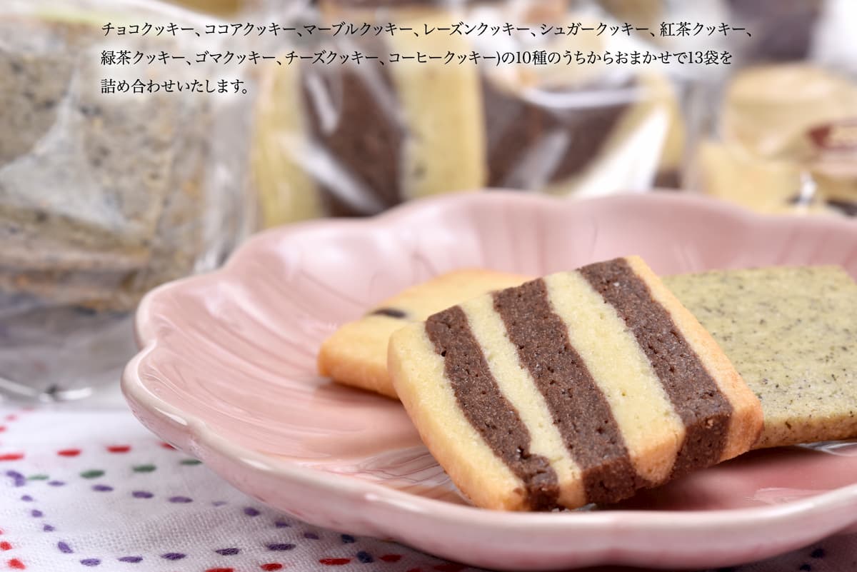 製品仕様 商品名 【ふるさと納税】手作りまごころ菓子ギフト(クッキー13袋 合計78枚) 名称 焼き菓子 商品内容 クッキー 内容量・個数 クッキー各種(おまかせ)13袋 1袋6枚入り 合計78枚 (チョコクッキー、ココアクッキー、マーブルクッキー、レーズンクッキー、シュガークッキー、紅茶クッキー、緑茶クッキー、ゴマクッキー、チーズクッキー、コーヒークッキー)の10種のうちからおまかせで13袋を詰め合わせいたします。
