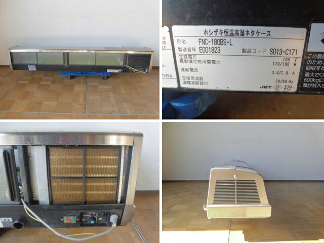 【商品仕様】 ・メーカー:ホシザキ ・管:D0496 ・型番:FNC-180BS-L ・2015年製 ・電源:100V 50/60HZ ・冷媒:HFC R134a ・サイズ:W1800×D345×H280mm ・質量:48kg ・内容積:69L ・付属品:スノコ×5、フィルター×1 【商品状態】 ・商品はUSED品です。