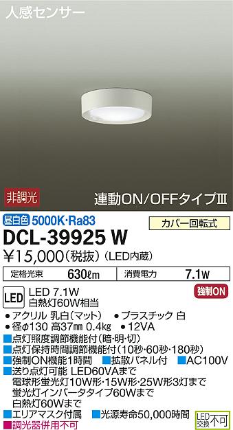 照明 おしゃれ かわいい大光電機 DAIKO 人感センサー付薄型シーリングライトDCL-39925W プラスチック 白 直付けタイプ LED(昼白色) 白熱灯60W相当 ※連動可能型