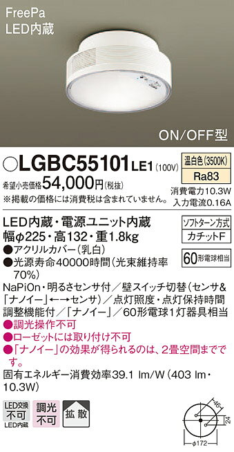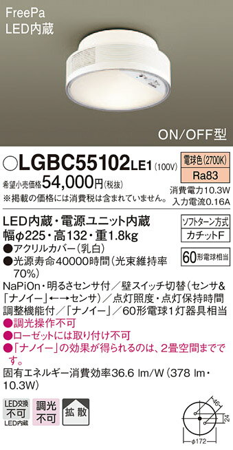 照明 おしゃれ ライトパナソニック Panasonic ナノイー搭載 小型シーリングライト トイレ用LGBC55102LE1 電球色LGBC55101LE1 温白色LGBC55100LE1 昼白色引掛シーリング方式 人感センサー/60形電球相当