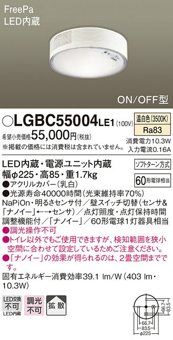 商 品 詳 細商品名インテリア 屋内 照明メーカー名パナソニック Panasonicメーカー器具名称シーリングライト(天井照明)仕様商品詳細光源◆LED(電球色タイプ) ◆色温度:2700 K ◆光源寿命40000時間(光束維持率70%)寸法・質量◆幅:φ225 mm ◆高:85 mm◆質量:1.7 kg仕様・注意事項LED照明の安心品質◆器具光束:378 lm ◆電圧:100 V ◆消費電力:10.3 W ◆消費効率:36.6 lm/W◆デザイン分類:Casual/Stylish Modern◆【アクリルカバー】乳白◆Ra83◆NaPiOn・明るさセンサ付◆壁スイッチ切替(センサ&「ナノイー」←→センサ)◆点灯照度・点灯保持時間調整機能付◆「ナノイー」◆60形電球1灯器具相当◆入力電流(100V時):0.16 A◆調光操作不可◆トイレ以外でもご使用できますが、検知範囲を狭小空間に合わせて設定しているためご注意ください。