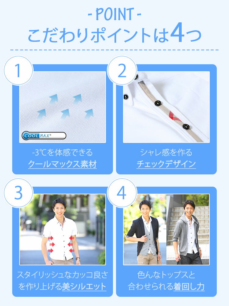■サイズ [半袖] SIZE:M/L/LL,XL/3L,XXL 肩幅:42/43/44cm/46cm 身幅:50/52/54cm/56cm 着丈:66/68/70cm/72cm 袖丈:20/21/22cm/23cm 袖刳:47/48/50cm/52cm [7分袖] SIZE:M/L/LL,XL 肩幅:43/44/45cm 身幅:50/52/54cm 着丈:68/70/72cm 袖丈:42/43/44cm 袖刳:47/48/49cm ■素材 【半袖】 ポリエステル60% 綿40% ポリエステル58% 綿42% 【7分袖】 綿58% ポリエステル42% (クールマックス) ■モデルデータ 【Shun】181cm/63kg 着用サイズ:L ■アイテム紹介 夏に欠かせないポロシャツ! 無地は好きなんだけど、なんか物足りない、、 そう感じる人のために【さりげなく】デザインをいれ 清涼感・クール・爽やか 3点を入れ込んだポロシャツを作りました! さりげなくチェックのデザインを4箇所に施しました! シルエットもスタイリッシュに 着心地は体感-3度を感じかせてくれるクールマックス素材! 生地もストレッチが効いており着心地抜群。