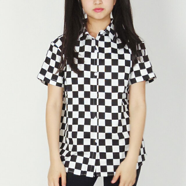 【10枚以上買うと1枚無料!】キッズ ダンス ダンス衣装 トップス チェック ストレッチ シャツ CQTY-01[ブロックチェック チェッカーフラッグ 黒 白 ガールズ ヒップホップ 格子 半袖 前開き 襟付き 男女兼用 かっこいい 子供 ダンス 服 韓国 レディース ]