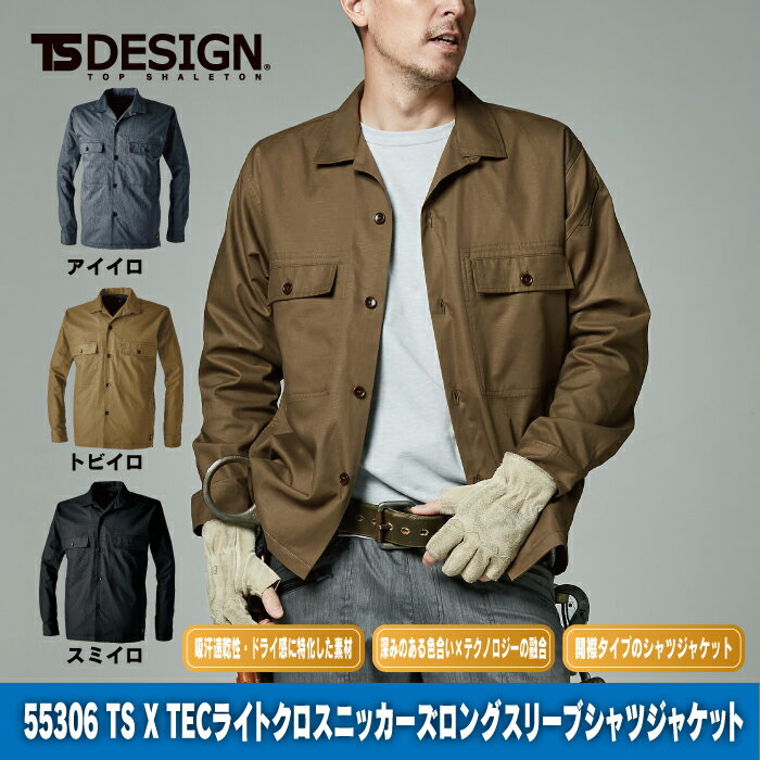 商品仕様・説明 【55306 TSXTECライトクロスニッカーズロングスリーブシャツジャケット】 ◇メーカー:藤和 TS DESIGN TS DESIGN ◇春夏用 ◇素材:TSクロステックライトクロス ポリエステル73% 綿20% 麻7% ◇機能:軽量・ストレッチ・形態安定性・2層構造糸・安心の日本製素材使用・マルチスリーブポケット ◇サイズ:S・M・L・LL・3L・4L・5L・6L ◇カラー:アイイロ・トビイロ・スミイロ 【詳細】 ◇カバーオール感覚で着用できるニッカーズの夏スタイル。